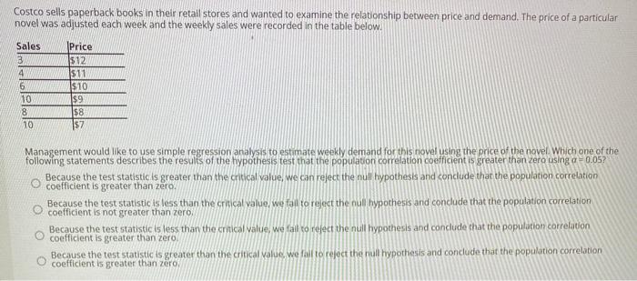 Solved Costco Sells Paperback Books In Their Retail Stores And Wanted T0 Examine The Relationship Between Price And Demand The Price Of A Particular Novel Was Adjusted Each Week And The Weekly